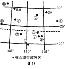 珠江三角洲是我国著名的经济发达地区,为了进一步加快其经济的引领作用,带动周边经济的发展,又划分了一个新的区域----泛珠江三角洲区域(即粤、桂、闽、赣、湘、滇、贵、川、琼、香港、澳门),图16是该区域的局部地区图,据此判断34~35题