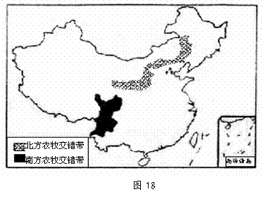 读我国南北方农牧业交错地带图,(图18)判断38-39题