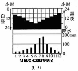 45.(20分)读某地的昼夜长短及降水量情况图(图21),请回答