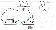 35(09襄樊)如图6所示,当开关闭合后,两螺线管向相反方向运动,请你把乙螺线管的导线连入这个电路(导线不能交叉)。
