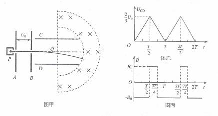 变化的图象如图乙所示。在金属板C、D右侧有一个垂直纸面向里的均匀磁场分布在图示的半环形带中,该环带的内、外圆心与金属板C、D的中心O点重合,内圆半径