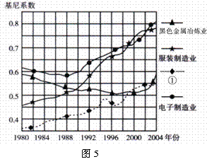 图5是我国不同产业空间集中程度及其变化趋势统计图(基尼系数越高,表明空间集中程度或专业化程度越高),读图回答9-10题。