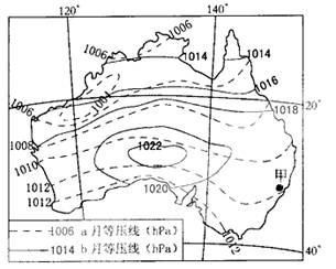 图中示意某大陆多年平均1月、7月海平面气压分布。读图完成5-6题。