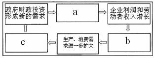 14. 2010年,我国继续实行积极的财政政策,财政仍将继续加大对民生工程的支持力度。政府财政投资若运用得当,一定量的政府投资,通过市场可以产生倍加于政府投资的对物品和劳务的总需求,这就是财政投资乘数效应。下图是财政投资乘数效应的过程示意图。根据所学经济生活知识,图中a、b、c处依次应该填入
