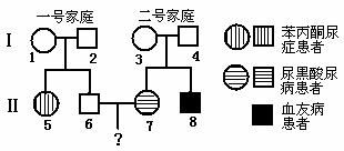 (3)上图为两个家庭的遗传系谱图。图中所示Ⅱ-5因缺乏上图示中的酶①而患有苯丙酮尿症,Ⅱ-7缺乏上图示中的酶②而患有尿黑酸尿症,Ⅱ-8不幸患血友病(上述三种性状的等位基因分别用Pp.Aa.Hh表示)。一号和二号家庭均不携带对方家庭出现的遗传病基因。
