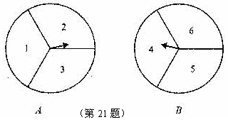 21.(本题满分10分)有两个可以自由转动的均匀转盘A、B,都被分成了3等份,并在每份内均标有数字,如图所示,规则如下: