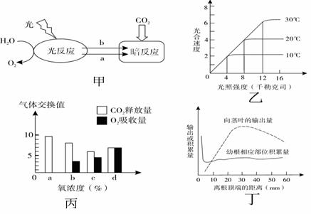 (4)丁图表示在适宜的条件下,一定时间内某无机离子从大麦幼根不同部位向茎叶的输出量和在大麦幼根相应部位积累量的变化。在自然情况下,土壤中该无机离子的浓度比根细胞中该无机离子的浓度 (低、高),所以幼根表皮细胞是通过 方式吸收土壤中该无机离子。只依据“幼根相应部位积累量”变化的曲线不能确定幼根20-60mm部位对该无机离子的吸收量,理由是 。