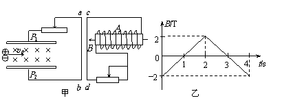 等离子气流由左方连续以v0射入Pl和P2两板间的匀强磁场中,ab直导线与Pl、P2相连接,线圈A与直导线cd连接.线圈A 内有随图乙所示的变化磁场.且磁场B 的正方向规定为向左,如图甲所示,则下列叙述正确的是 (