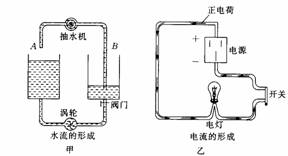 16.如图12甲所示是水流形成图,我们对电流的成因(如图乙所示)的认识是通过分析图甲中水流