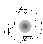 地点M距地面200km,远地点N距地面340km。进入该轨道正常运行时,其周期为T1,通过M、N点时的速率分别是V1,V2。当某次飞船通过N点时,地面指挥部发出指令,点燃飞船上的发动机,使飞船在短时间内加速后进入离地面340km的圆形轨道,开始绕地球做匀速圆周运动,周期为T2,这时飞船的速率为V3。比较飞船在M、N、P三点正常运行时(不包括点火加速阶段)的速率大小和加速度大小,及在两个轨道上运行的周期,下列结论正确的是: