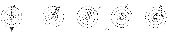 如图甲所示,a是地球赤道上的一点,某时刻在a的正上方有b、c、d三颗轨道位于赤道平面的卫星,各卫星的运行方向均与地球自转方向(顺时针转动)相同,其中d是地球同步卫星。从此时刻起,经过时间t(已知时间t均小于三颗卫星的运行周期),在乙图中各卫星相对a的位置最接近实际的是