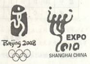 世博会会徽。观察两个会徽有惊人的相似之处,即二者都以汉字(前者是“京”字,后者是“世”字)书法和拟人的形象作为会徽的主体内容。这反映了( )