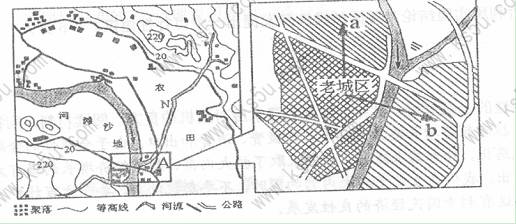 (2)右图是该小组虚拟的A城规划图,该城计划向a、b两个方向发展。结合图分析:与b相比,向a方向发展的优势。(8分)