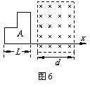 图6中A是一底边宽为L的闭合线框,其电阻为R。现使线框以恒定的速度v沿x轴向右运动,并穿过图中所示的宽度为d的匀强磁场区域,已知L< d,且在运动过程中线框平面始终与磁场方向垂直。若以x轴正方向作为力的正方向,线框从图6所示位置开始运动的时刻作为时间的零点,则在图7所示的图像中,可能正确反映上述过程中磁场对线框的作用力F 随时间t变化情况的是( )