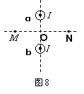 有两根长直导线a、b互相平行放置,图8所示为垂直于导线的截面图。在图示的平面内,O点为两根导线连线的中点,M、N为两根导线附近的两点,它们在两导线的中垂线上,且与O点的距离相等。若两导线中通有大小相等、方向相同的恒定电流I,则关于线段M N上各点的磁感应强度的说法中正确的是 ( )