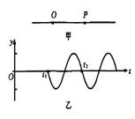 如图甲所示,O点为振源,OP = s,t = 0时刻,O点由平衡位置开始向下运动,产生沿直线OP向右传播的简谐横波.如图乙为P点的振动图象(从t1时刻开始振动).则以下说法中正确的是