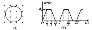 (18分)一电阻为R的金属圆环,放在磁场中,磁场与圆环所在平面垂直,如图(a)所示,已知通过圆环的磁通量随时间t的变化关系如图(b)所示,图中的最大磁通量