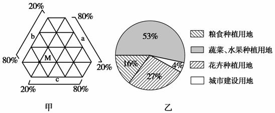 25. 若图甲中M为该县目前农业用地的比重(a为花卉用地,b为果蔬用地,c为粮食用地)。图乙为该县今后的农业土地规划。据此判断,该县今后土地利用的变化趋势是