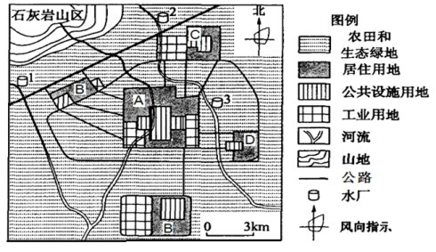 (2)该城市规划在B处建成以水泥生产为主的建材生产基地,你认为是否合理,并说明理由。