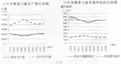 (1)据材料一中的图文资料,说明从1999年到2008年以来山东省粮食和蔬菜的总产量和播种面积分别有怎样的变化?并由此进一步分析引起这种变化的原因有哪些?(15分)