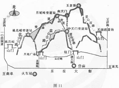 泰山是我国著名的风景名山,号称五岳之首。其旭日东升、晚霞夕照、黄河金带、云海玉盘被誉为四大奇观。图11为泰山旅游线路示意图,读图回答下列问题。