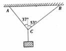 (7分)轻绳的两端A、B固定在天花板上,绳能承受的最大拉力为120N.现用挂钩将一重物挂在绳子上,结果挂钩停在C点,如图所示,两端与竖直方向的夹角分别为37°和53°.求: