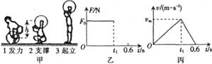 23.(15分)举重运动是力量和技巧充分结合的体育项目.就“抓举”而言,其鼓术动作可分为预备、提杠铃、发力、下蹲支撑、起立、放下杠铃等6个步骤,图甲所示的照片表示了其中的几个状态.现测得轮子在照片中的直径d=O.8 cm,在照片上用尺量出从发力到支撑,杠铃上升的距离^=1.2 cm.已知运动员所举杠铃的直径D:32 cm,质量m=120 kg,运动员从发力到支撑历时c=0.6 s,为简便起见,可以认为在该过程中运动员作用于杠铃上的竖直向上的作用力与时间的关系,以及在该过程中杠铃的速度与时间的关系分别如图乙、丙所示.(取g一10 m/s。)