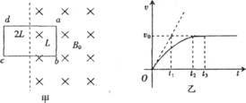 24.(18分)一磁感强度为B。的有界匀强磁场区域如图甲所示,质量为,,l、电阻为R的矩形线圈abcd边长分别为L和2L,线圈一半旮磁场内,一半在磁场外.£一0时刻磁场的磁感应强度开始均匀减小,线圈中产生感应电流,在磁场力作用下运动,其运动的”一f图象如图乙所示,图中斜向虚线为过0点速度曲线的切线,数据由图中给出.不考虑重力影响:求: