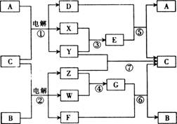 其中A、B、C、D、E、F、G为化合物,x、Y、z、w为单质,X为红色固体。w为黄绿色气体,Y和Z均为色无味气体;常温常压下C为无色液体;A、E、F三种物质的相对分子质量之比为4:2 : 1.请回答下列问题: