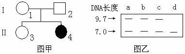 21. 下图甲中4号为X病患者,对1、2、3、4进行关于X病的基因检测,将各自含有X病基因或正常基因的相关DNA片段(数字代表长度)用层析法分离,结果如下图乙。下列有关分析判断正确的是