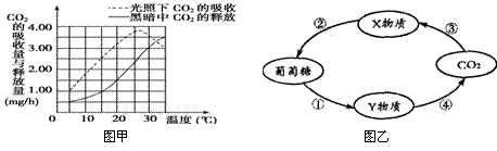 30.下图甲、乙表示某植物内的光合作用与呼吸作用过程及其与温度的关系,有关叙述正确的是