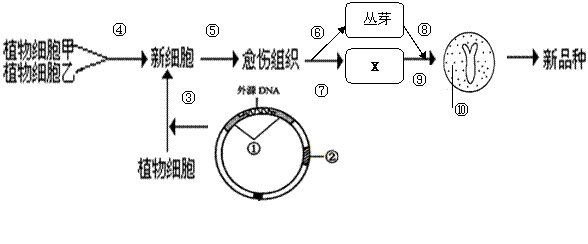 (2)图中从愈伤组织到形成完整的新品种植株的途径有两条,具体通过哪条途径主要取决于培养基中的____________________________________的种类及其浓度配比。用植物组织培养制作的人工种子,可解决有些作物品种的____________________________________等问题,其形成要到图中的____________________________________(写结构名称),⑩的主要作用是____________________________________。