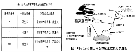 (1)科研人员用放射线处理某大肠杆菌获得两个突变株A和B,然后对A和B进行实验,结果如上表。突变株A不能在一般培养基上生长的直接原因是_______________________________________________。将突变株A和B混合在一起接种于一般培养基中,却能正常生长的最可能原因是________________________。
