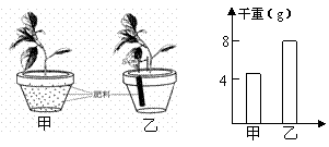 (12分)为了研究营养物质在土壤中的分布情况对植物生长状况的影响,研究人员将长势相同的两株豚草分别栽种到甲、乙两个花盆中,并施以相同重量的有机肥。甲盆的肥料均匀分布,乙盆的肥料集中放在距豚草5cm远的洞中,按常规浇水,在温度、光等环境因素都相同的条件下培养,9周以后,分别称量甲、乙两株豚草的干重。装置及结果如右图所示。