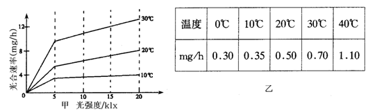 Ⅱ.(10分)将金鱼藻置于一烧杯中培养,甲图表示不同温度下,金鱼藻光合速率(用每小时O2释放量表示)与光照强度的关系。乙表表示呼吸速率(用每小时O2消耗量表示)与温度的关系。据图回答: