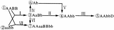 下图是用农作物①和②两个品种分别培育出④、⑤、⑥、⑦ 四个品种的过程,A、a和B、b、D为基因,且A、a和B、b位于非同源染色体上。