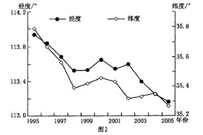 碳排放是指二氧化碳等温室气体的排放。图2示意1995-2005年我国人均碳排放重心的变动趋势。完成8-9题。