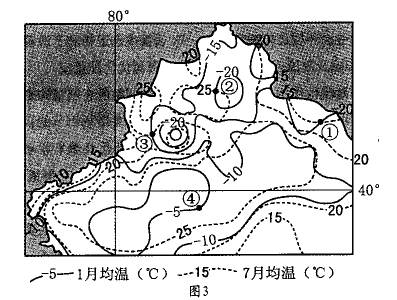 图3示意我国某区域一月和七月气温分布。读图完成10-11题。
