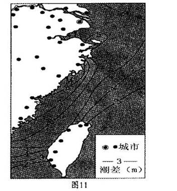 在一个潮汐周期内,相邻高潮位与低潮位之间的差值,称为潮差。图11示意我国某海域潮差分布,结合所学知识回答下列问题。