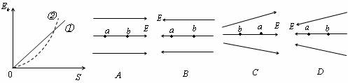 21.有一个负点电荷只受电场力的作用,分别从两电场中的a点由静止释放,在它沿直线运动到b点的过程中,动能EK随位移s变化的关系图象如左下图中的①、②图线所示,则能与图线相对应的两个电场的电场线分布图分别是下图中的( )