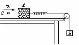 25.(18分)如图所示,劲度系数为k的轻质水平弹簧的左端固定在质量为mA=4m的物块A上,右端系一不可伸长的轻质细线,细线绕过轻质光滑的定滑轮后与质量为mB=2m的小物块B相连.物块A放在足够长的水平桌面上,它与桌面间的摩擦因数m,且知物块A与桌面的最大静摩擦力正好等于滑动摩擦力.滑轮以左的细线始终处于水平,整个系统当初处于静止状态.某时刻,一颗质量等于m的子弹以初速度v0水平击中物块A,并留在其中,物块A向前滑行一小段距离s而停下,此后将不再滑动.试求: ![]()