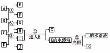 28.(15分)下列框图中的A ~ K物质均为中学常见物质。已知B、D、E、L常温下为密度比空气大的气体,D、E为单质,其它为化合物。A和I都是常用的漂白剂,F的焰色反应呈黄色。F、G均能与L的水溶液反应放出B。请根据图示关系回答问题: