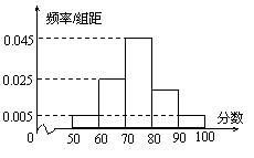 某区高二年级的一次数学统考中,随机抽取200名同学的成绩,成绩全部在50分至100分之间,将成绩按如下方式分成5组:第一组,成绩大于等于50分且小于60分;第二组,成绩大于等于60分且小于70分;……第五组,成绩大于等于90分且小于等于100分,据此绘制了如图所示的频率分布直方图.