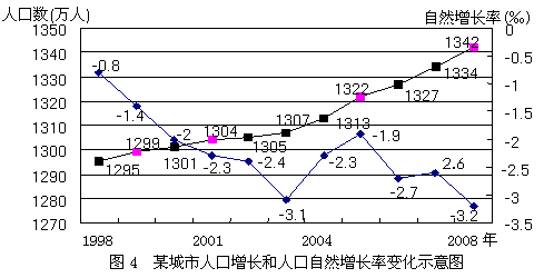 下图是我国某城市人口数和人口自然增长率变化示意图。读图回答10-11题。