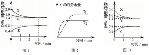 14.T℃时在2L密闭容器中使X(g)与Y(g)发生反应生成Z(g)。反应过程中X、Y、Z的浓度变化如图1所示;若保持其他条件不变,温度分别为T1和T2时,Y的体积百分含量与时间的关系如图2所示。则下列结论正确的是( )
