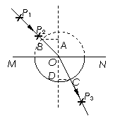 所示,某同学用插针法测定一半圆形玻璃砖的折射率.在平铺的白纸上垂直纸面插大头针P1、P2确定入射光线,并让入射光线过圆心O,在玻璃砖(图中实线部分)另一侧垂直纸面插大头针P3,使P3挡住P1、P2的像,连接O P3.图中MN为分界面,虚线半圆与玻璃砖对称,B、C分别是入射光线、折射光线与圆的交点,AB、CD均垂直于法线并分别交法线于A、D点. 设AB的长度为l1,AO的长度l2,CD的 长度为l3,DO的长度为l4,为较方便地表示出玻璃砖的折射率,需用刻度尺测量