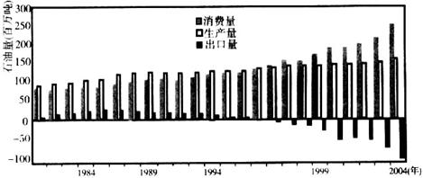 下图是“我国石油消费、生产和出口状况变化图”,读图回答问题。