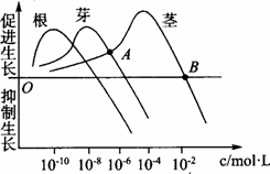 (2)A点所对应的生长素浓度对芽生长的效应是 ,B点所对应的生长素浓度对茎的生长效应是 。
