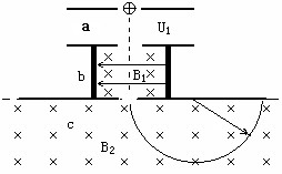 质谱仪原理如图所示,a为粒子加速器,电压为U1;b为速度选择器,磁场与电场正交,磁感应强度为B1,板间距离为d;c为偏转分离器,磁感应强度为B2.有一个质量为m,电量为+q的粒子(不计重力),在如图所示位置由静止经加速后,该粒子恰能通过速度选择器,然后进入分离器后做匀速圆周运动,求: