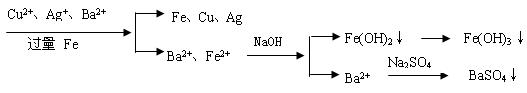 至此可得出(3)中X为Fe,固体为Cu、Ag、Fe三种混合物。②为Fe2+、Ba2+则选B、D。可顺序写出③的化学方程式Na2SO4 + Ba(NO3)2 = BaSO4↓+ 2NaNO3。本题实际上是考查离子Ag-+ 、Ba2+、Cu2+的鉴定和分离,这些知识点正好是高一化学教材必修1首先要学习的主要内容。这样学科间的承接就体现知识内容承上启后的系统性。